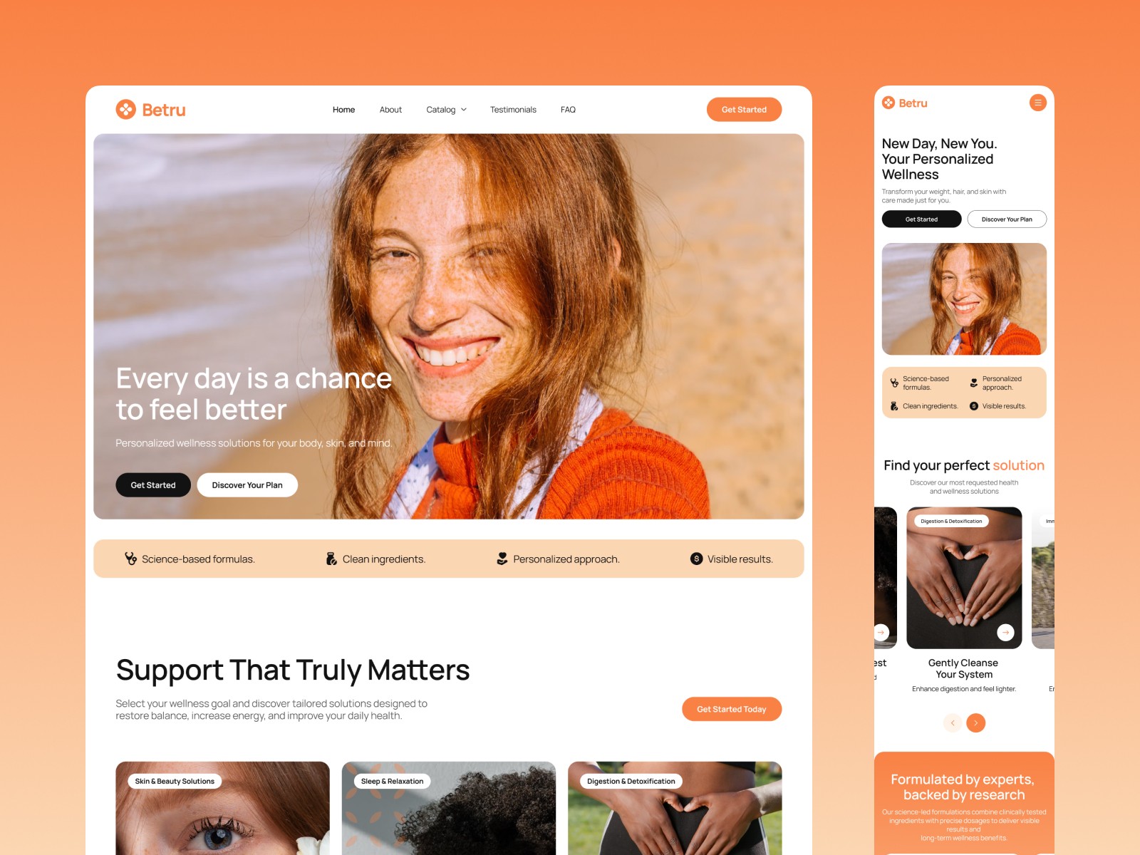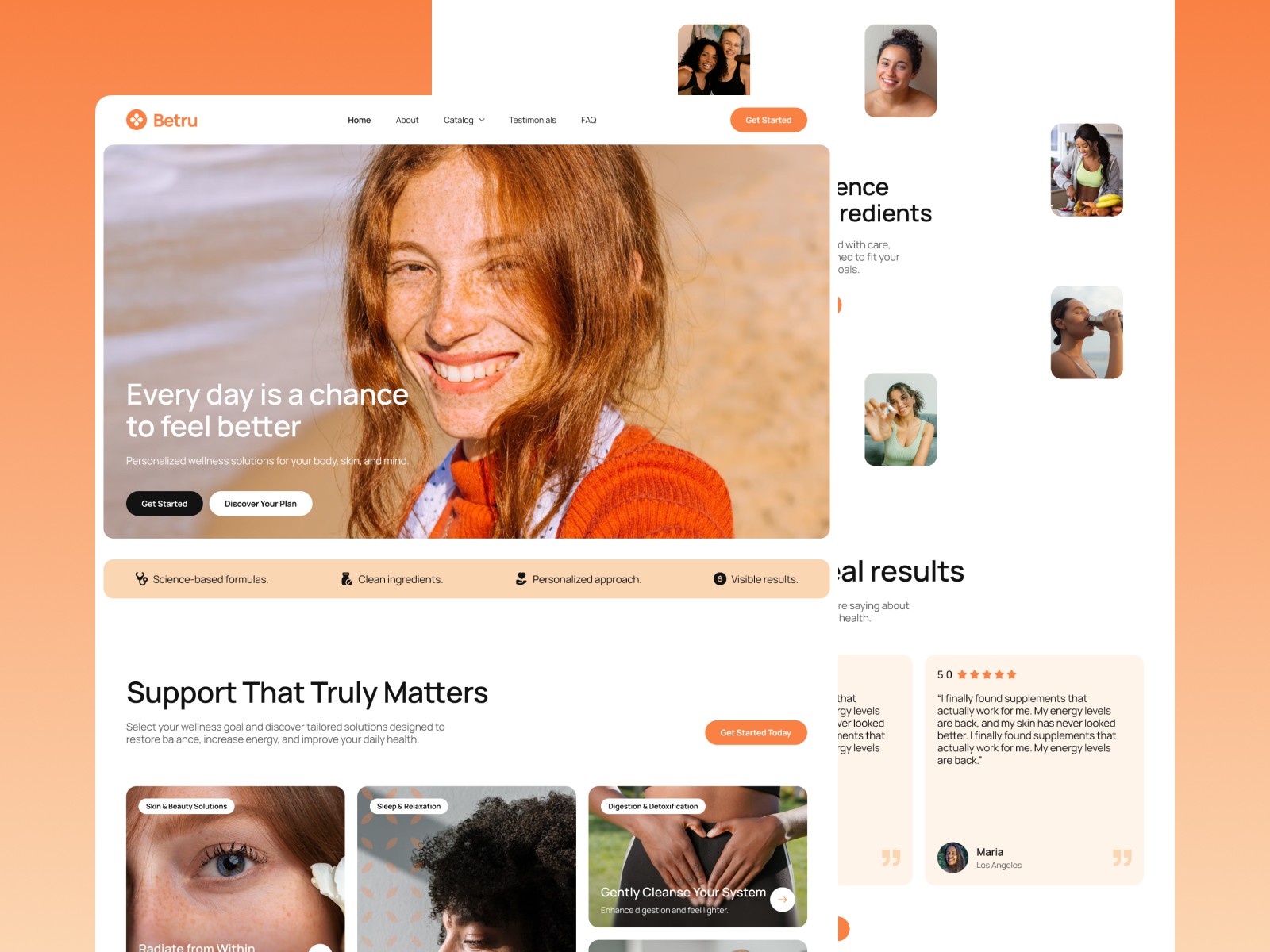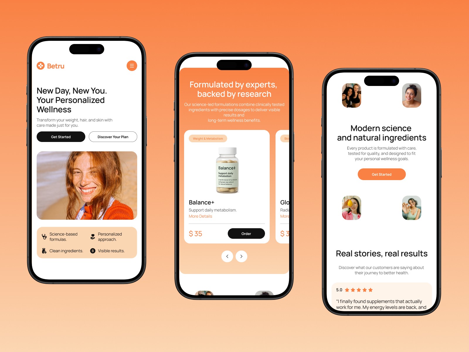 This project presents a conversion-focused website template for modern wellness and health brands. Betru communicates calm, trust, and scientific care, making it suitable for wellness platforms, skincare brands, and holistic health companies. A clear, structured layout translates expert-led, research-backed solutions into an intuitive user journey while reinforcing a credible, mindful brand presence.